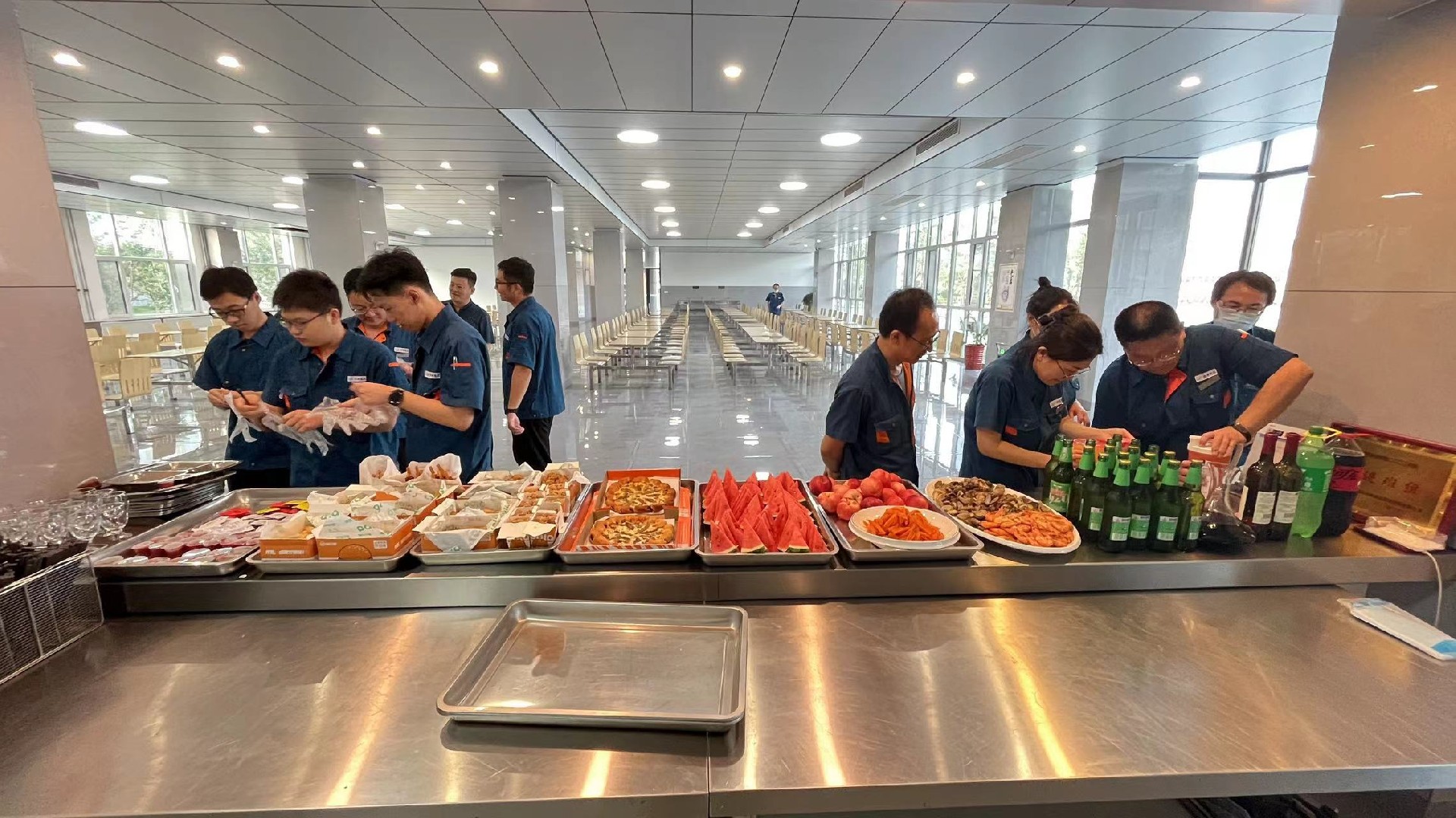 晚上,企業管理中心為導師及新員工們準備了豐盛的歡迎冷餐會,按照膠東的習俗,每逢大事吃團圓餃子,大家一起和面,一起拌餡,一起動手包水餃。師傅們紛紛對徒弟表示:“吃了水餃,咱們就是一家人了,好好干。”師傅徒弟和公司領導相對而坐,開懷暢飲,暢所欲言,自己包的餃子格外的香。